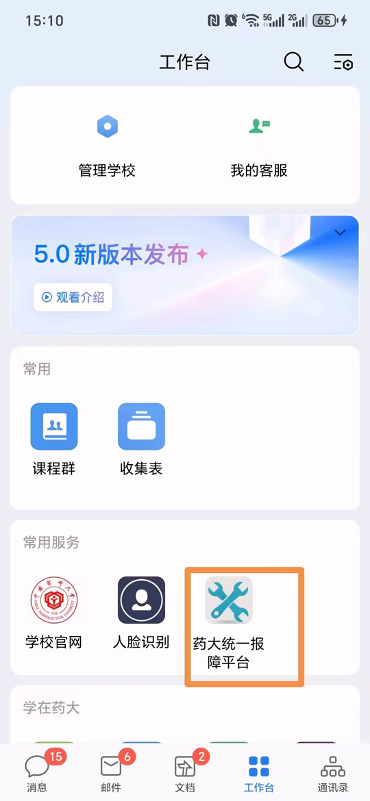 1.打开企业微信,找到“工作台”,点击“药大统一保障平台”