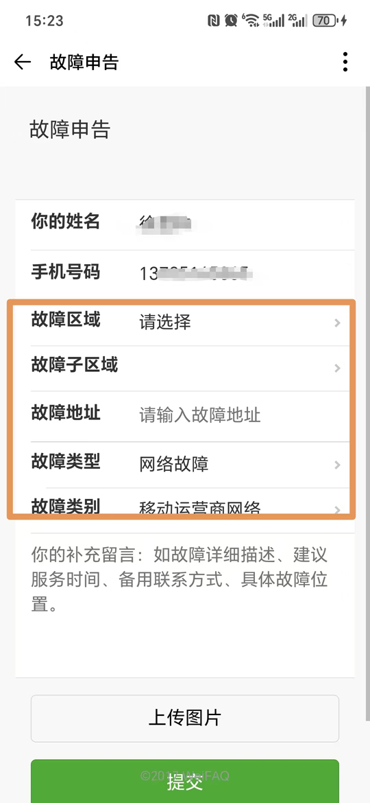 3.找到下方故障一栏,分别选择或填写填写故障区域、子区域、故障地址、故障类型等,最后点击“提交”。