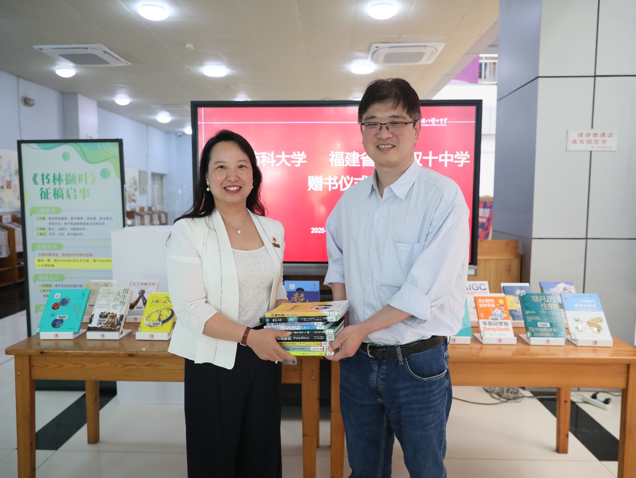 期间,黄艳代表图书馆向厦门双十中学捐赠了一批药学、医学、生物学、心理学、人工智能相关图书,为高中学子送上“精神食粮”,让高中学子们感受到药学知识的魅力,增进对药学行业、大健康产业的了解。捐赠仪式上,黄艳书记分享了中国药科大学图书馆在文化育人方面的举措,期待以中国药科大学图书角为纽带,推动两校文化共建。